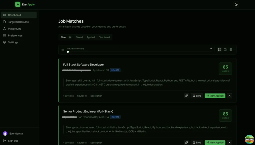 The full loop is working. Jobs get scraped and scored every morning. He opens the dashboard, sees ranked matches with reasons, generates a tailored resume for anything worth applying to, and marks it as applied when he submits. The Playground gives him tools to understand roles before committing to an application.
